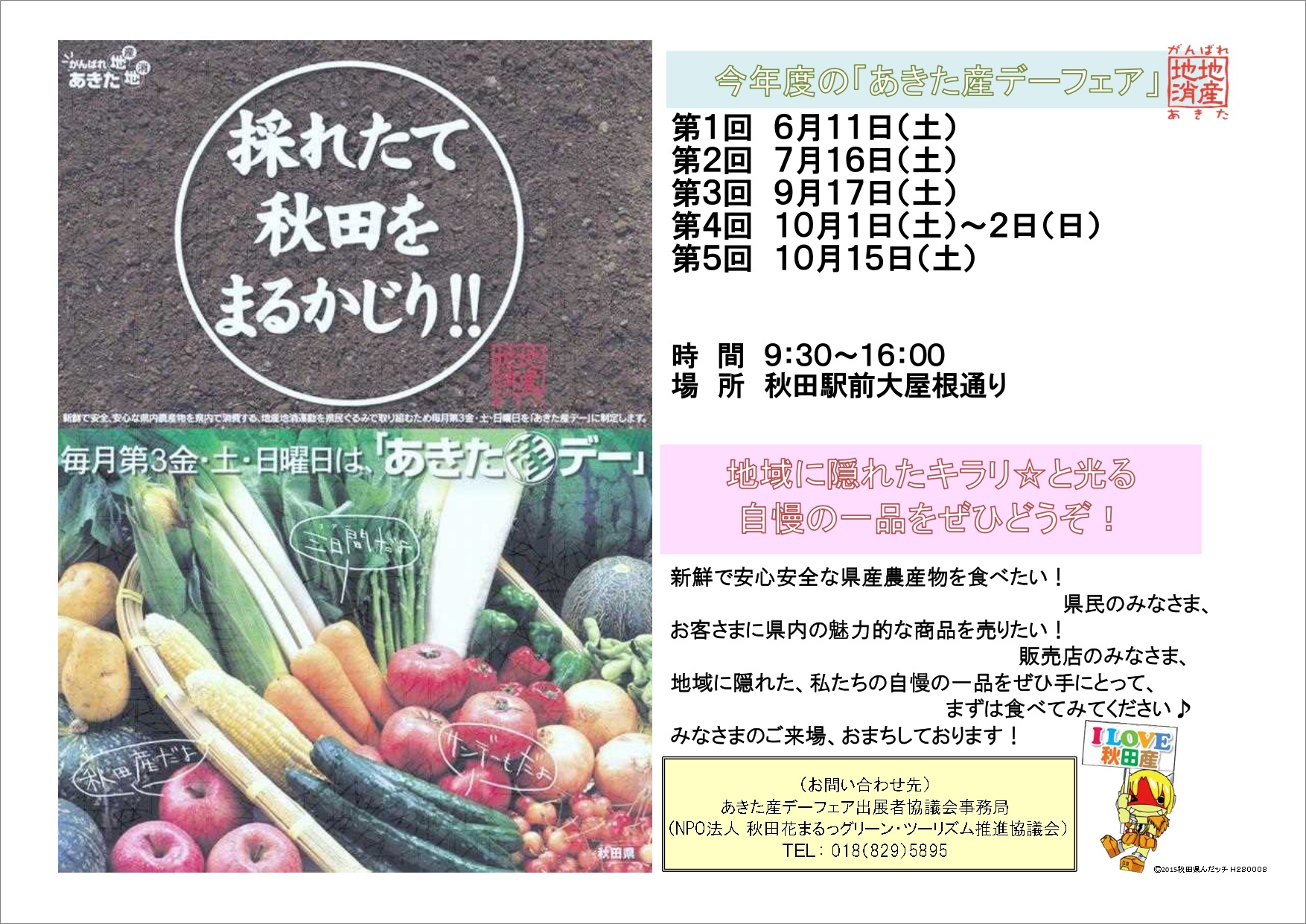 秋田の旬の農産物や加工品など、県内各地から美味しい食べ物が集まる「あきた産デーフェア」を開催します。