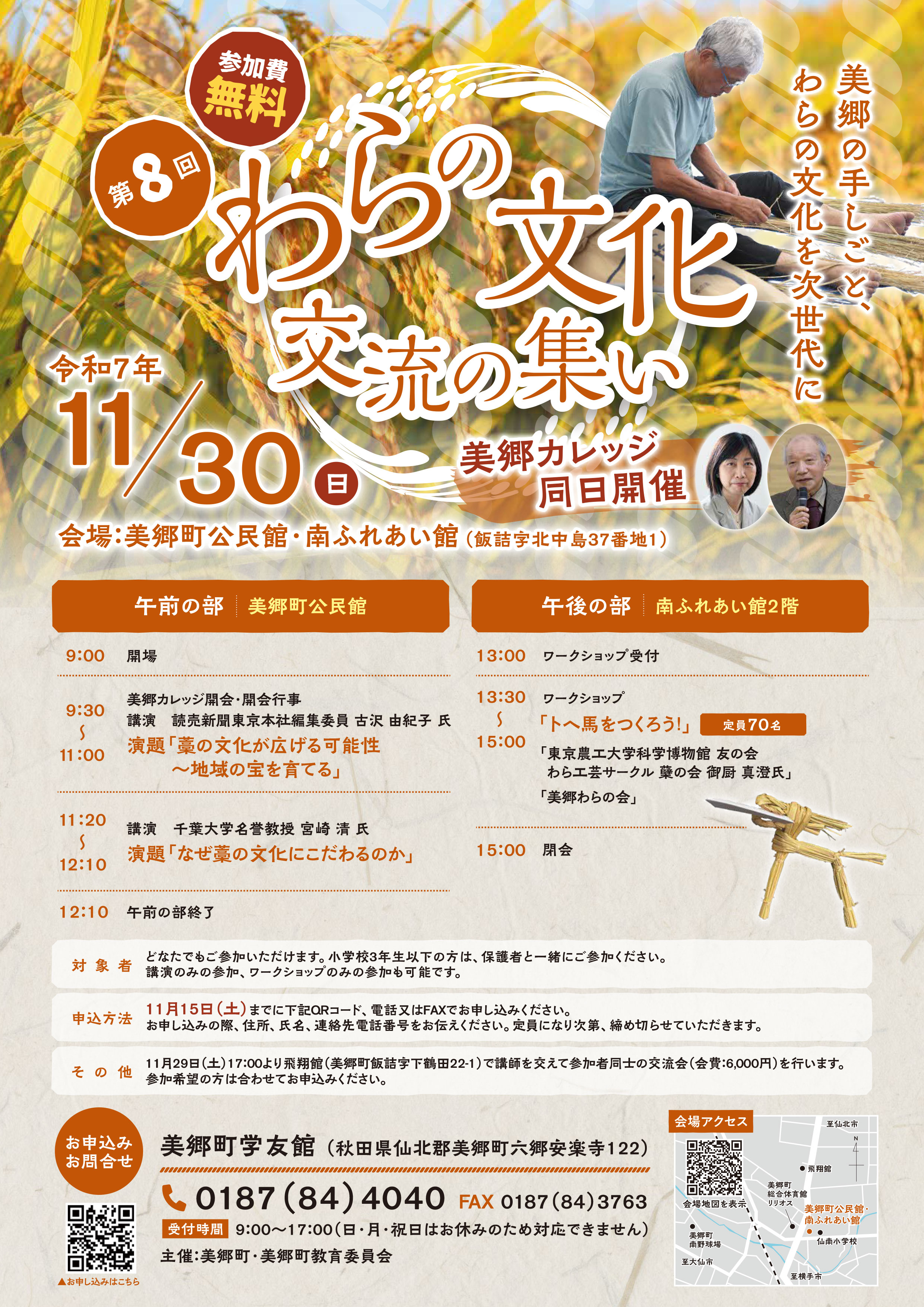 11月30日(日)、美郷町教育委員会主催でわらの文化を次世代に引き継いでいくことを目的に開催します。当日は、午前の部に古沢由紀子氏(読売新聞東京本社編集委員)と宮崎清氏(千葉大学名誉教授)による講演、午後の部は、ワークショップ「トヘ馬をつくろう!」(講師:東京農工大学科学博物館友の会 わら工芸サークル 藁の会 御厨真澄氏・美郷わらの会)を行います。ご興味のある方ならどなたでも無料で参加可能です(午前の部、午後の部それぞれ要申込)。今年は美郷カレッジと同時開催により例年より日程が早まっております!お見逃しなく!