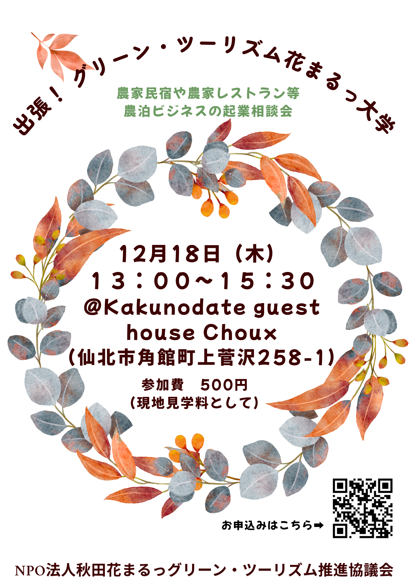 4回目は、Kakunodate guest house Choux(仙北市)で開催します。トレーラーハウスに泊まれるゲストハウスとして国内外のお客様に大人気!各種OTAを上手に活用されながら運営されています。「ゲストハウスって何?」「ドミトリーって?」etc.百聞は一見に如かず。現地見学付きの相談会は、今年度最後となります!もちろん、ご要望に応じて農泊ビジネスに関する講話も行います。グリーン・ツーリズムについて、一緒に考える時間を過ごしてみませんか?