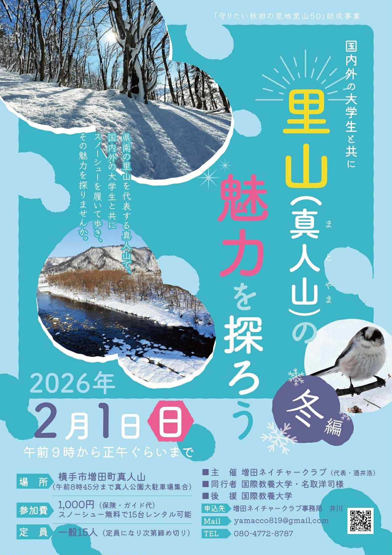 「守りたい秋田の里地里山50」に認定された横手市真人山地域をフィールドに活動している増田ネイチャークラブでは、「国内外の大学生と共に里山(真人山)の魅力を探ろう」を開催します。県南の里山を代表する真人山で、国内外の大学生と共にスノーシューを履いて歩き、その魅力を探りませんか?