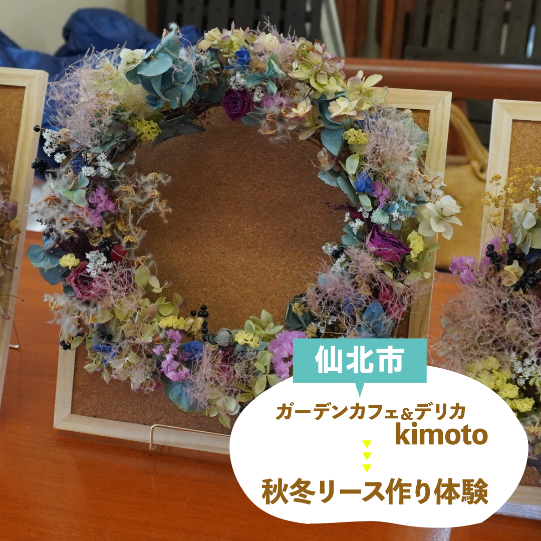 kimotoの庭に咲いた花で作る、シックな色合いに変わるナチュラルリース作りを体験します。体験後にあるお茶タイムもお楽しみに。