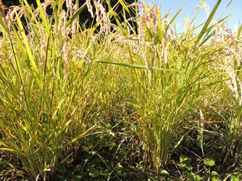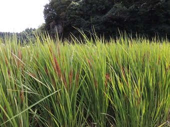 | 午前中の作業はここまで。ホニョ掛けが田んぼにほぼ等間隔に現れました。 田んぼの数箇所には、古代米の姿も。 |