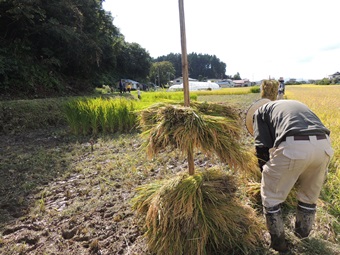 誰かが声をかけるということもなく、皆さんの足が自然と田んぼに向かう午後のスタートでした。 「繰り返し作業やってて、子どものときにお袋に稲の束ね方を習ったの思い出したよ。来年、自分の田んぼで稲刈りやるときに、高齢のお袋が『そうじゃない!』なんて言って田んぼに出てくるようになったら、嬉しいなぁ」 |