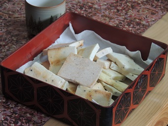 | 作業の場を和ませてくれたのは、星雪館の薪ストーブ。「体の芯から温まるね」と皆さん。 | そして、こちらは焼いた干し餅。食感もよく、子どもたちもよく食べていました(^^) | |