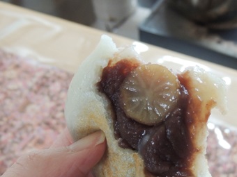 | おやつをいただきました!星雪館特製のおやきです。 | なんと中にはあんこに埋もれたいぶりがっこ!甘さの中に独特の香りとしょっぱさ。大好評でした。 | |