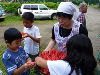 一方で、オーナーに登録した人以外にも、農作業体験をしたい、自然体験をしたいという たくさんの人たちが毎回参加してくれ、イベントを大いに盛り上げてくれました。 この団体は、世界的な環境保護活動をしているNGO「FoE Japan」のメンバーで、 連休を利用した3日間の日程で藤里町に滞在しているということでした。 |