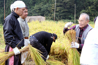 秋田市から参加した女性(左中央)は、 「子供に体験をさせたくて」と小学生の息子と一緒に汗を流しました。 その男の子も、時間とともに稲刈りの腕を上げて、最後には「楽しかったです」とひとこと。 母親は、「子供のために参加したけど、結局自分が楽しんでしまいました。 秋田の方言を聞けたのも良かったです」と、親子で充実した時間を過ごしてくれたようです。 また、善吉さんから束ね方を教わっているこの女性(右)は、 「藤里町が大好きだから」という夫と共に秋田市からお越しで、 来るたびにその魅力に引き込まれ、おいしい食材を購入しては味わっているそうです。 |