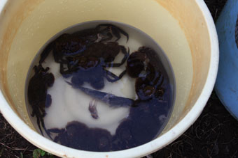 仕掛にはアユのほか、カニも捕まるということで、河川敷に置かれたたらいの中には たくさんのカニが入っていました。漁は今月いっぱい行われるということです。 |