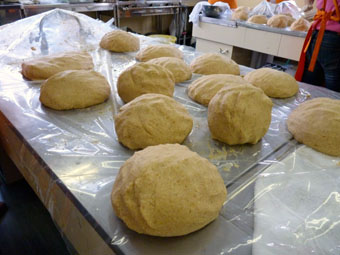 潰した大豆をさきほど混ぜた塩とこうじに合わせ、さらにまぜまぜ…。なかなか力が要ります。 |