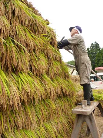 7~8束ずつ刈り取り一束にまとめ、「そくだて(地元で“うまっこ”と言っていました)」にし、三日ほど置いてからはさ架けをします。 |