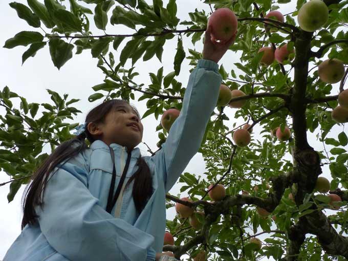 ●平鹿りんごのもぎ取り体験 平鹿地域は、全国でも有数のりんごの産地。 今回は「大森町グリーン・ツーリズム推進協議会」の会員、加藤美和子さんの果樹園で、「千秋」の収穫体験が行われました。 |