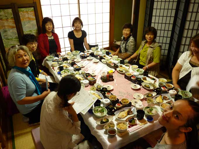 昼食会場となった農家・漁家レストラン「和み庵 京かのこ」の様子。色とりどりの小鉢に盛られた宝石のような料理たちに、参加者からは感嘆の声があがった。 |