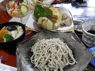 昼食は、ご主人の手打ちそばがメイン。そばに添えられたおかずは、お椀いっぱいの煮付けに、旬の食材を玄米粉で揚げた天ぷら。特に、にかほ市の特産品である「北限のいちじく」の天ぷらとマリネは、そのアイディアも美味しさもインパクトがありました。