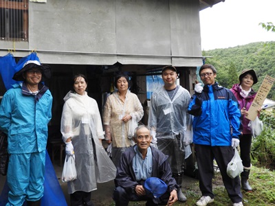 「山遊庭の森」の阿部重助さんとお手伝いにきてくれた「農家民宿・産直やしお」の大坂さん。阿部さんの案内で早速、山の中へと進みました。