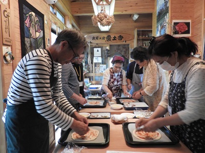 一行は、にかほ市にある食育工房 農土香(のどか)に向かいました。地元に豊富にある旬の食材をたっぷりと使用した地産地消料理を提供する農家レストランで、オーナーの渡辺広子さん(写真:前列右)は、米粉ピザ作りの体験等を通じて食育活動にも力を注いでいます。