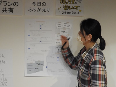 まちづくりファシリテーターの平元美沙緒さんによるワークショップをスタート。「開業する自分をイメージする」をテーマに、研修生に事前に提出してもらったワークシートを使って自分の考えを説明してもらいました。