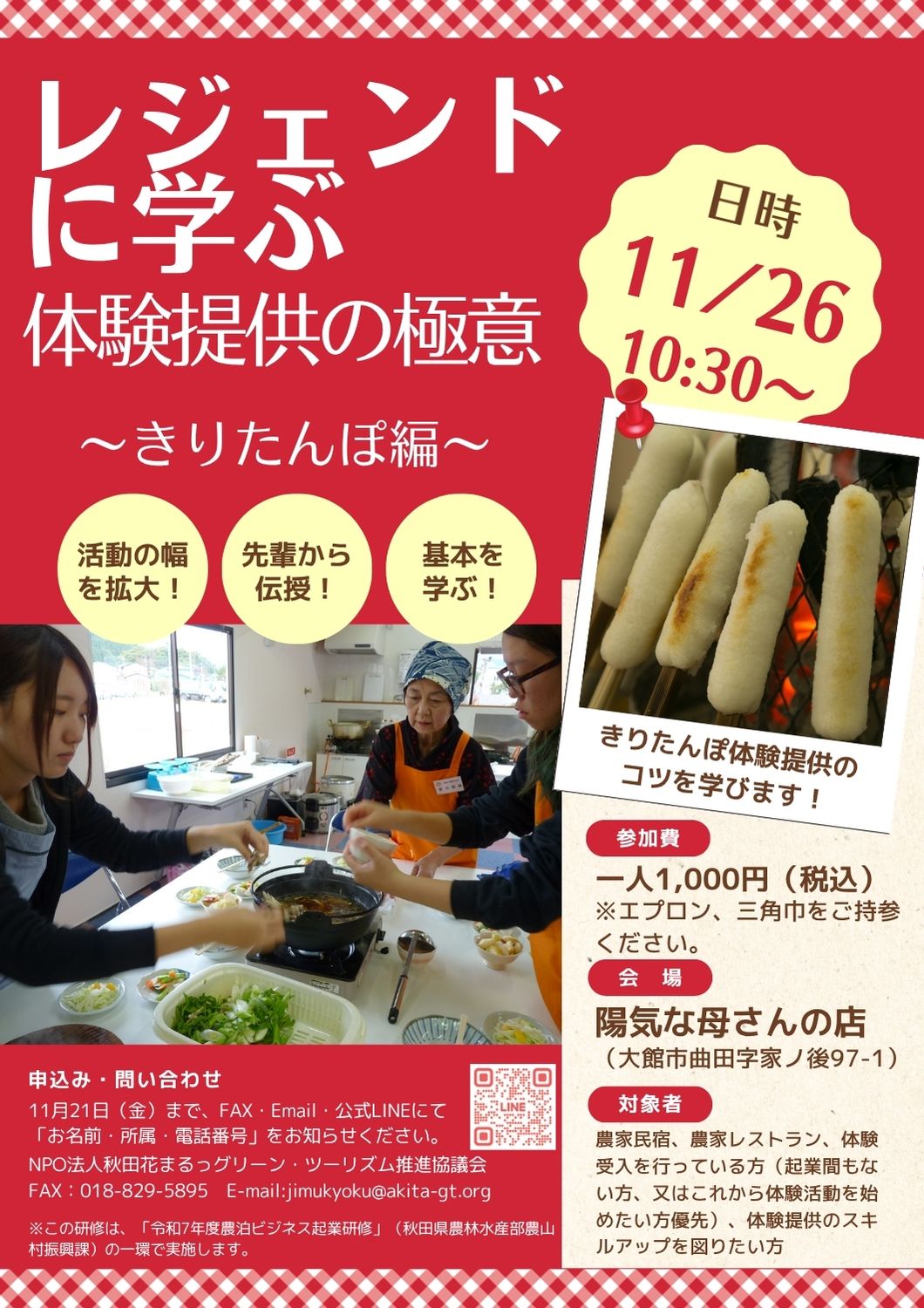 講師は、本場・大館市できりたんぽ体験受入のレジェンド・陽気な母さんの店が務めます!
