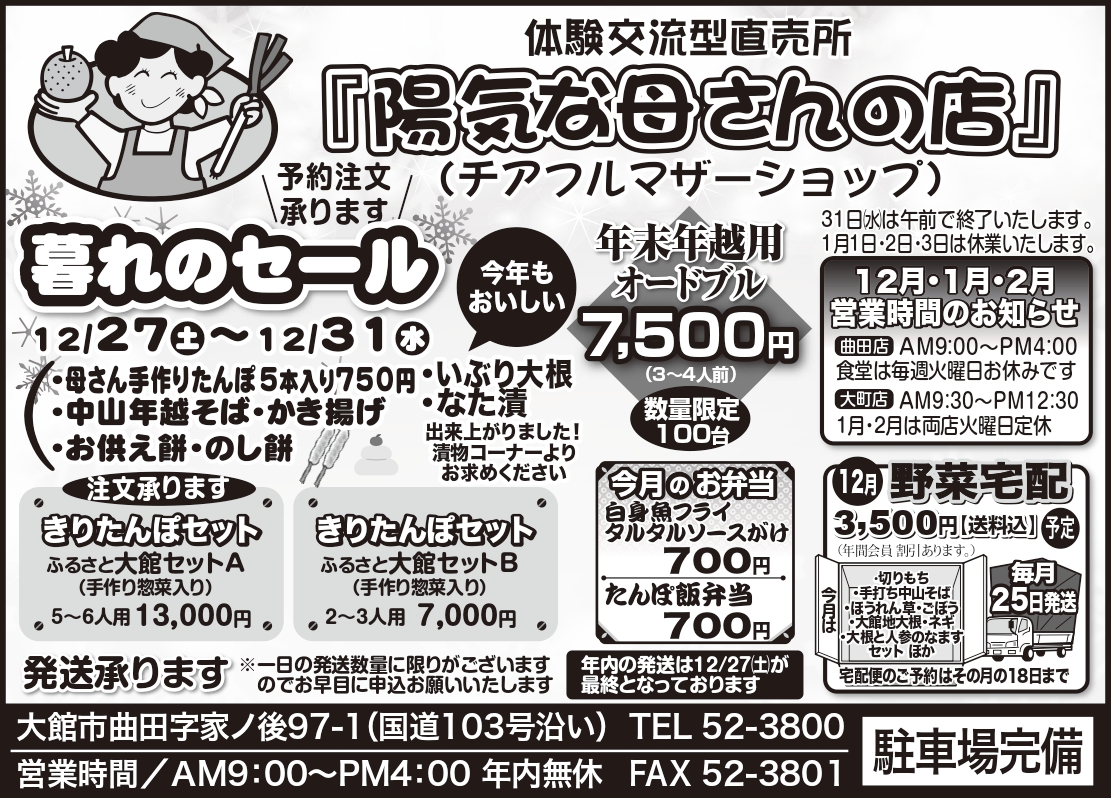 12月・1月・2月は営業時間と定休日のお知らせがありますので要チェック!そして、今年もおいしい「いぶり大根」「なた漬け」が出来上がりましたよ~!お店に行ったら漬物コーナーも要チェックです!