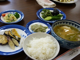 | 夏野菜の天ぷらや漬け物、ミズたたき、ミズのかやきなどをおかずに、東成瀬産の食材たっぷりのお昼ごはんをいただきます! | ||
