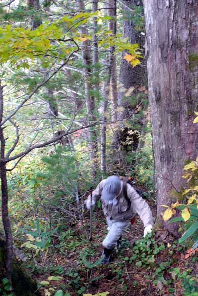 | ▲尾根筋コースを辿る 様ノ沢との分水嶺に至る小沢はナメ滝となっているが、左岸の尾根筋にはっきりとした踏み跡がある 右の写真は、その尾根筋から赤水渓谷を見下ろすように撮影・・・ 右手の屹立するスラブ壁は、ほとんど潅木類も生えないほど傾斜がきついのが分かる |