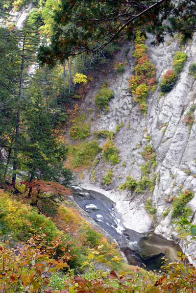| ▲色付き始めた赤水渓谷 かつては、左の写真手前が入渓地点だったが、淵が深く危険なため 現在は、大きな淵の上流に出る地点に変更されていた 右の写真のとおり、トラロープを頼りにナメ床に下りる |