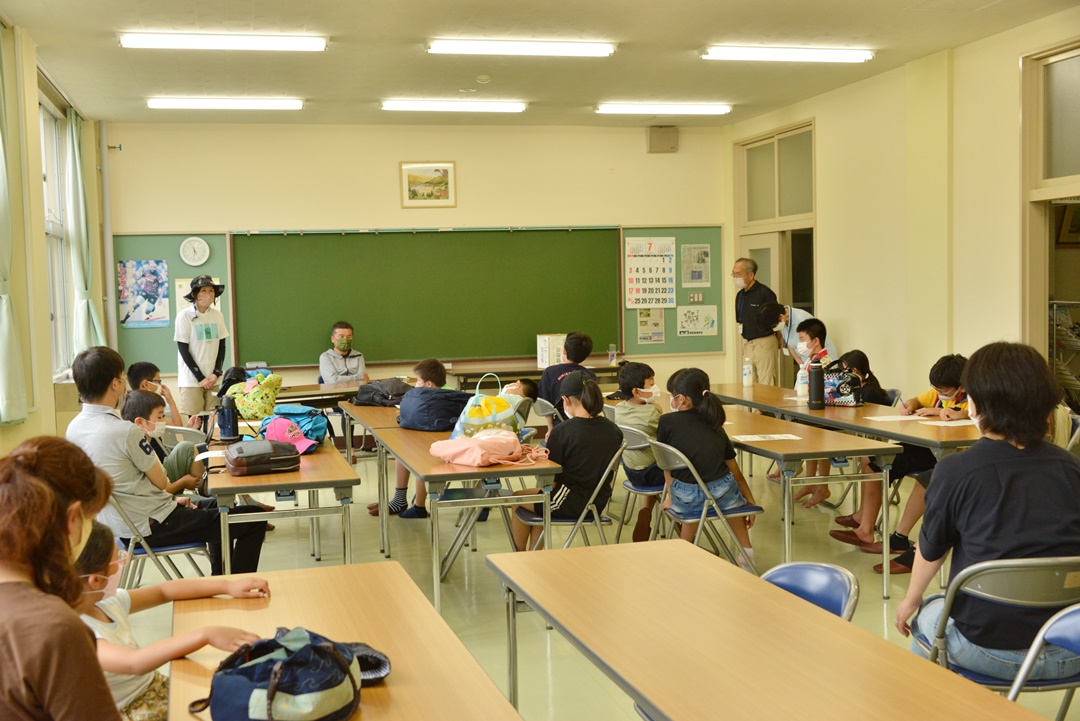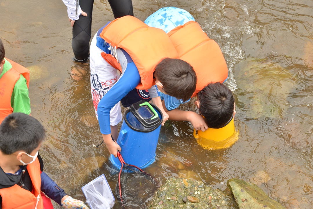 The 4th "Tsurikichi Sanpei no Sato" Nature Experience School was held in the Saruhannai area. In this event, children entered a river to search for living creatures. Under the advice of the Masuda Nature Club (Representative: Mr. Hiroshi Sakai), children who reside in Akita Prefecture searched for creatures living in the Harusannai River, using underwater viewers and other tools.