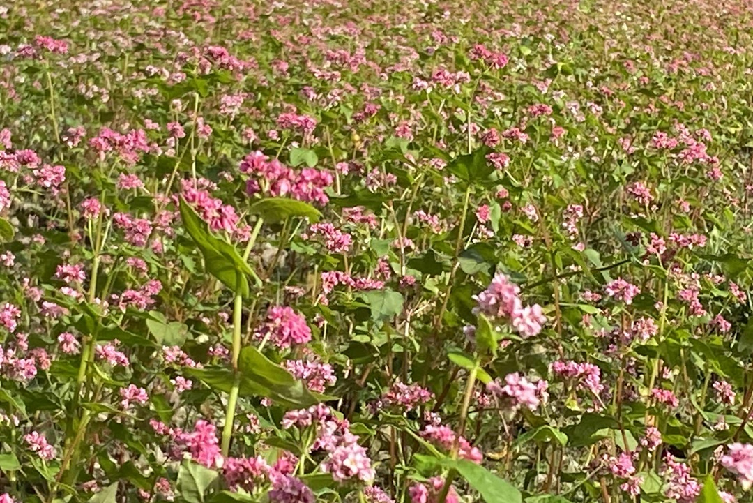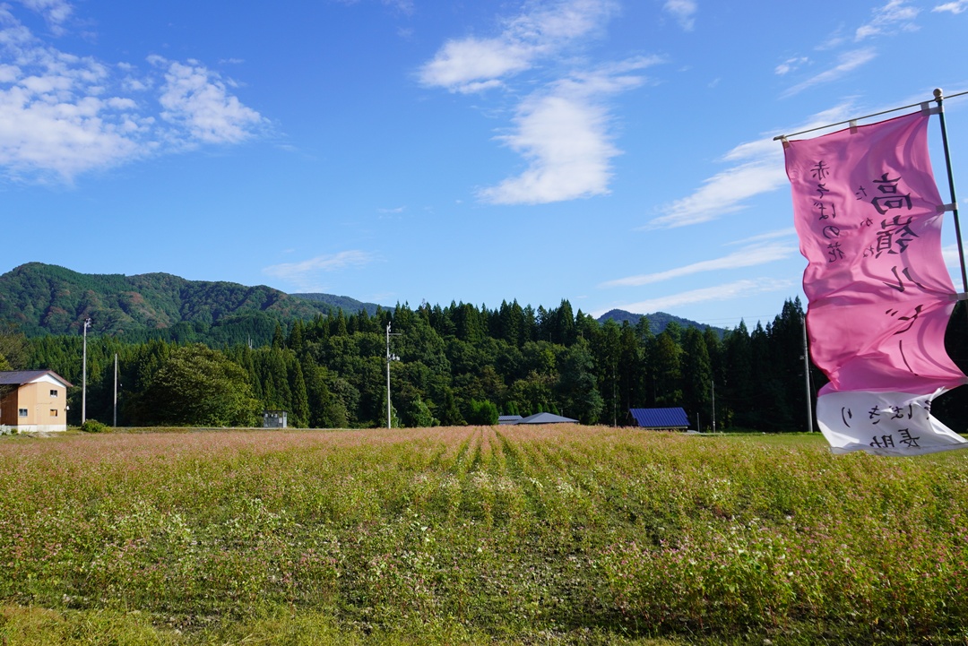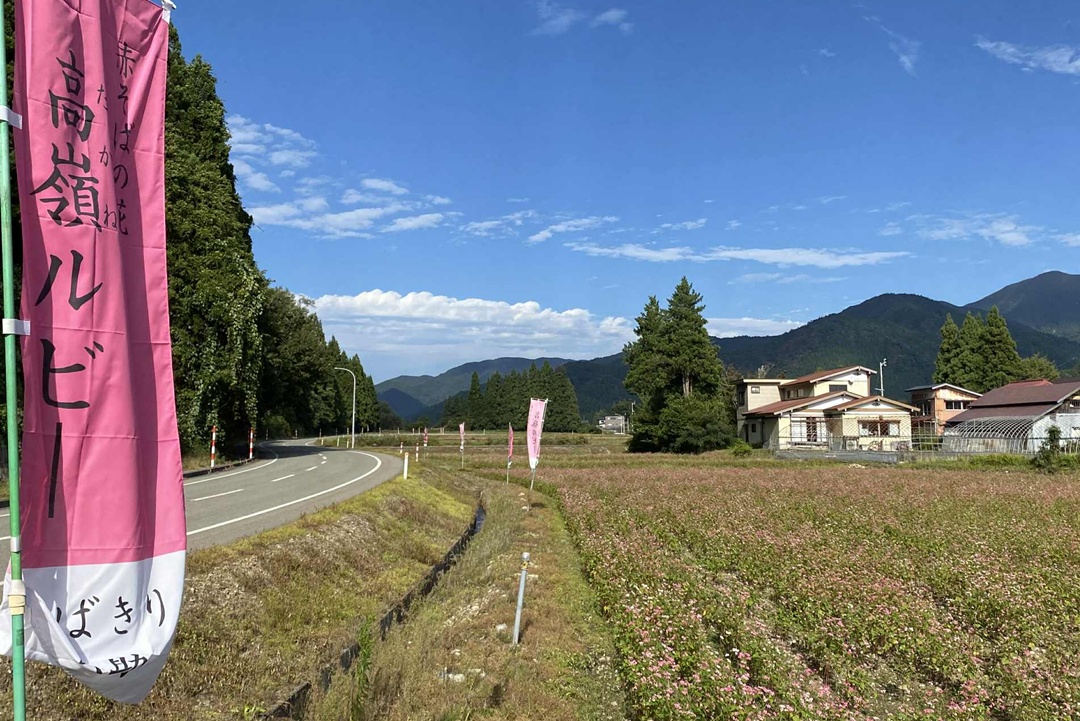 ここは美郷町のみずほの里ロード沿いにある「そばきり長助(仙北市)」の赤そば畑で、種子栽培を行っています。生産から提供まで一貫して手がける店主の鈴木さんは、「赤そばをもっと知ってもらえるように」とピンクのノボリを立てています。