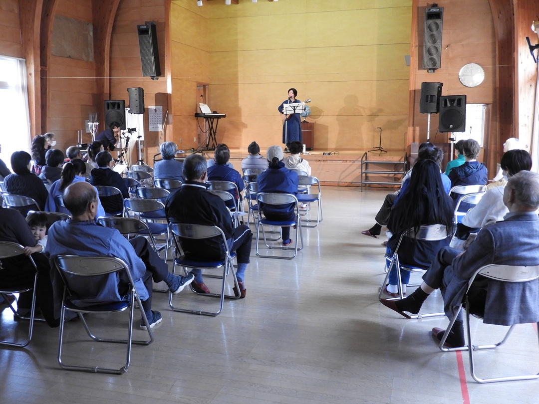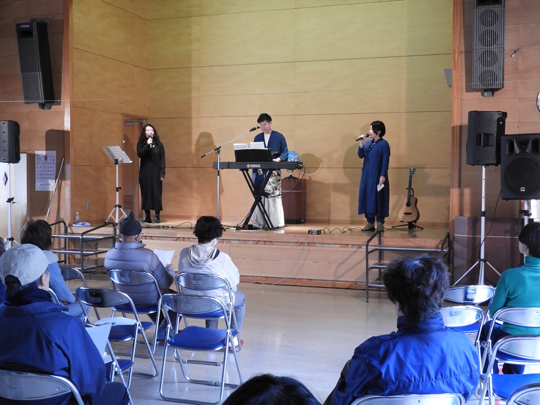 茜さん(写真右)のお姉さん・しおりさん(写真左)もゲストに。そして今回コンサートやミュージカルワークショップのため、五城目町を訪れていた汰生喜さん(中央)。旧馬場目小学校を会場に「秋のふるさとコンサート」が開催されました。五城目町に移住したシンガーソングライターの保坂茜さんと、元劇団四季団員の汰生喜(Taiki)さんによる歌声とピアノの音色が温かく来場者の心を包みました。