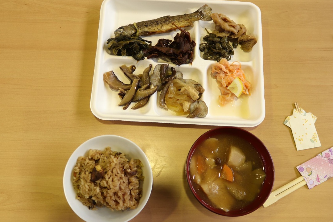 滝めぐりから戻ると、体育館には鹿角の特産を使った料理がテーブルいっぱいに。