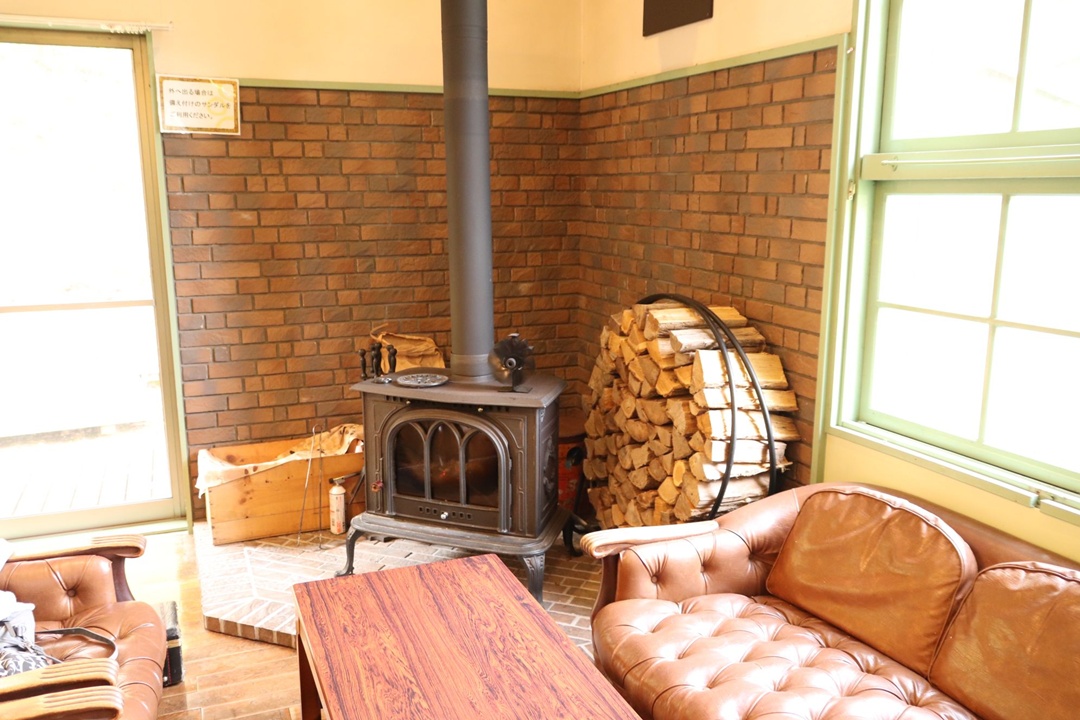談話室には、ソファーと薪ストーブ。居心地がよくて居眠りしそう。