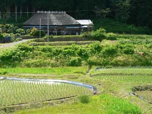 | ▲蒐沢(あざみざわ)の茅葺民家と棚田 熟語の蒐田は、狩り、狩猟を意味する言葉である。田代上仙道やすぐ隣の鳥海町にもマタギ集落があった。そうした田畑の少ない山間奥地であることを考えると、山に依存した狩猟+農耕の暮らしがあったことは否定できない。そう考えると、「蒐沢」の地名こそふさわしいようにも思う。 |